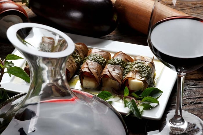 Aubergine rolls stufed with cheesePrimitivo at Wickhams